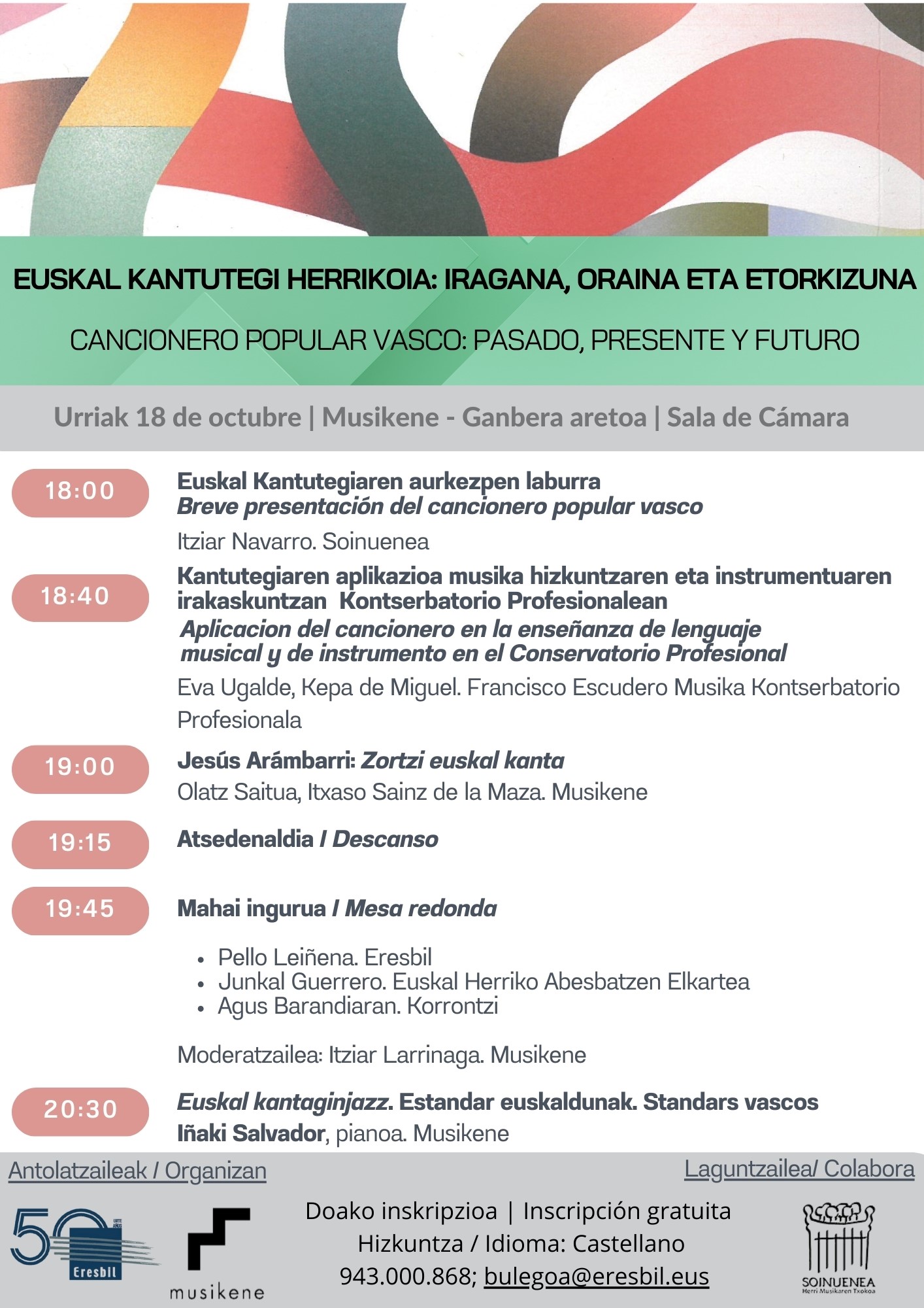 Organizada de manera conjunta entre Musikene, Eresbil y Soinuenea, esta jornada propone un acercamiento a la historia, aplicación, vigencia y futuro del cancionero popular vasco, como herramienta indispensable de la transmisión musical y cultural en nuestro territorio. Diversos especialistas del ámbito de la etnomusicología, la documentación, la interpretación y la creación, nos darán claves significativas a través de amenas charlas y tertulias así como experiencias prácticas. Más información aquí